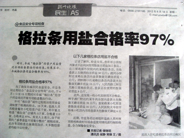 为了确保阜城市民食盐安全,市盐务局近期结合“食品安全宣传周”活动,于6月1日至15日期间对阜城“格拉条”经营户用盐情况开展专项检查整治行动。